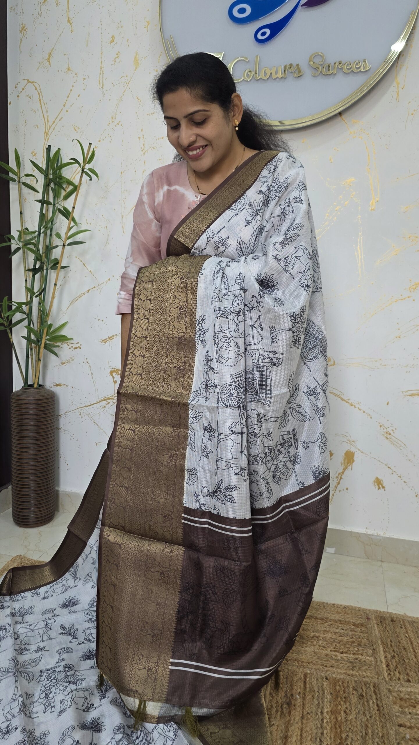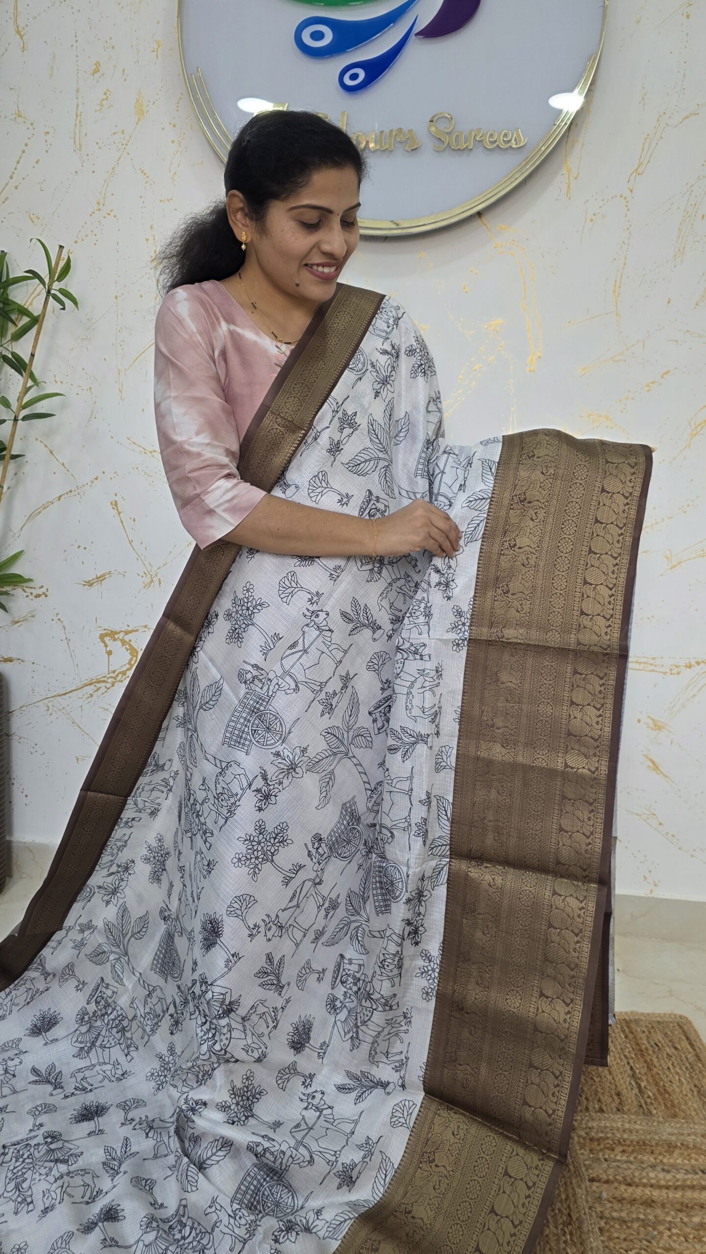Celebrate timeless elegance with this beautifully crafted saree that blends traditional artistry with everyday sophistication. The saree features an off-white base adorned with intricate black line-art motifs inspired by rural life, nature, and folk elements, giving it a classic yet distinctive charm.