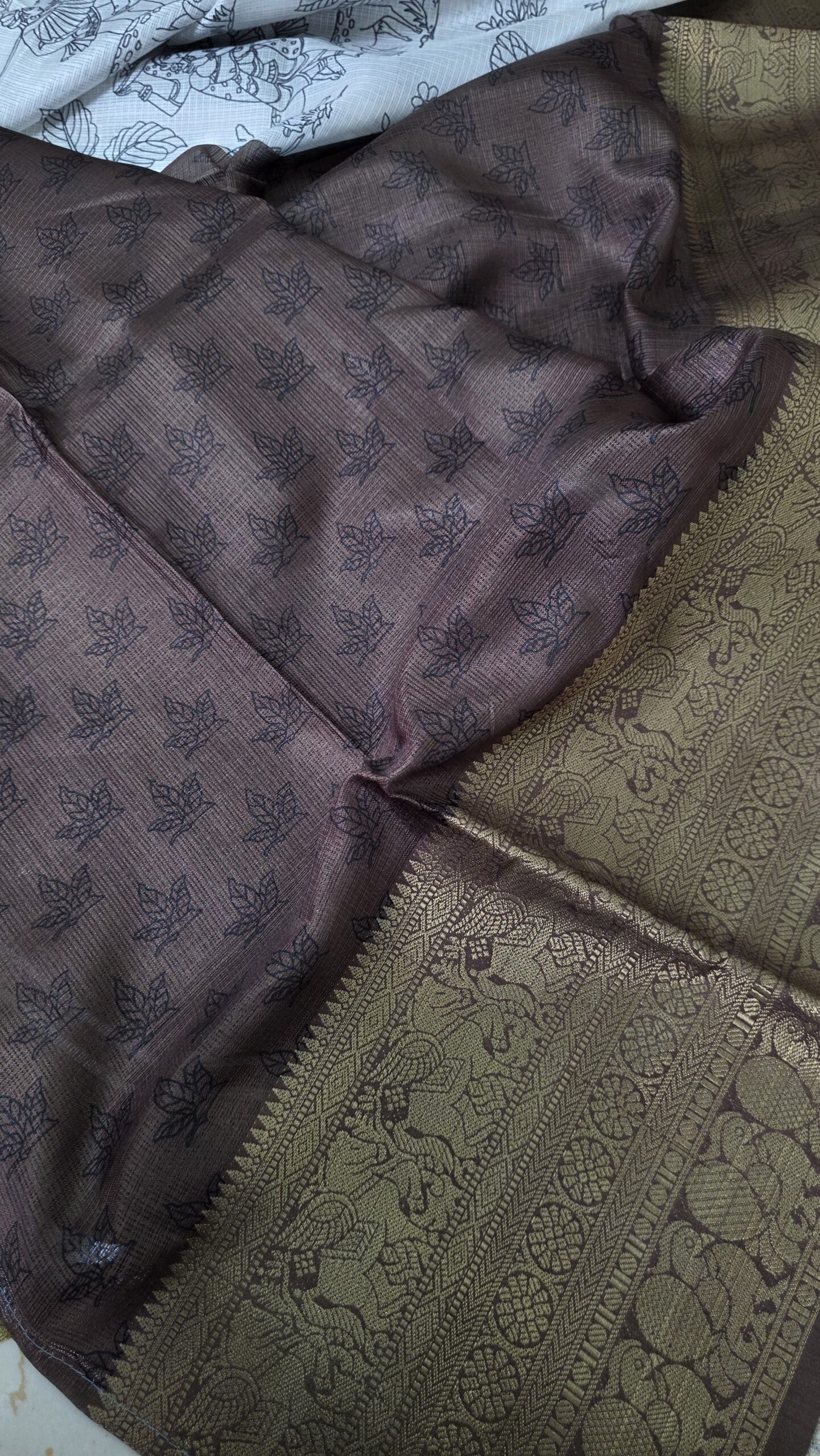 A rich coffee-brown woven border with traditional patterns adds depth and contrast, elevating the overall look. The soft, lightweight fabric drapes effortlessly, making it comfortable for long hours while maintaining a graceful silhouette.