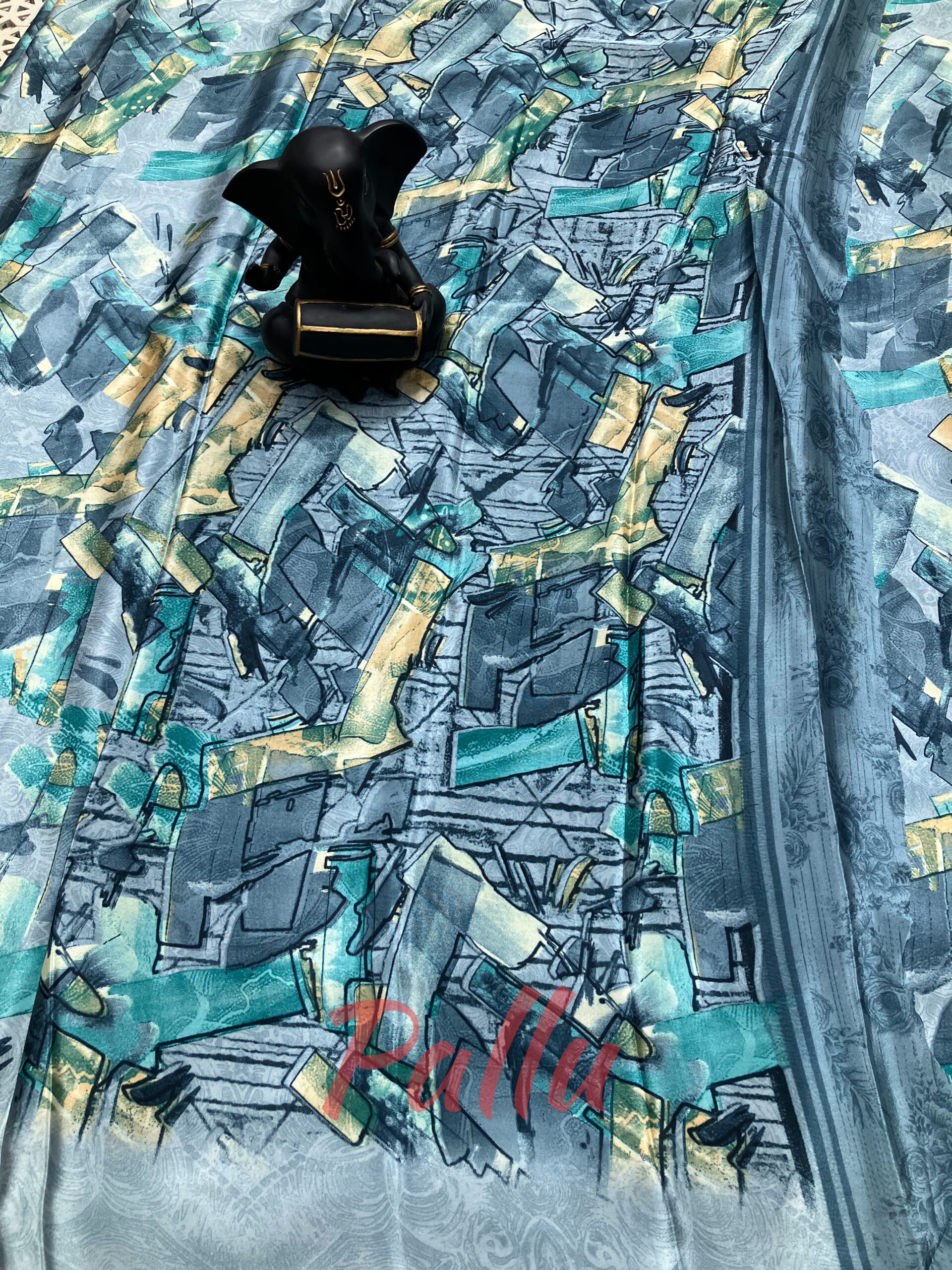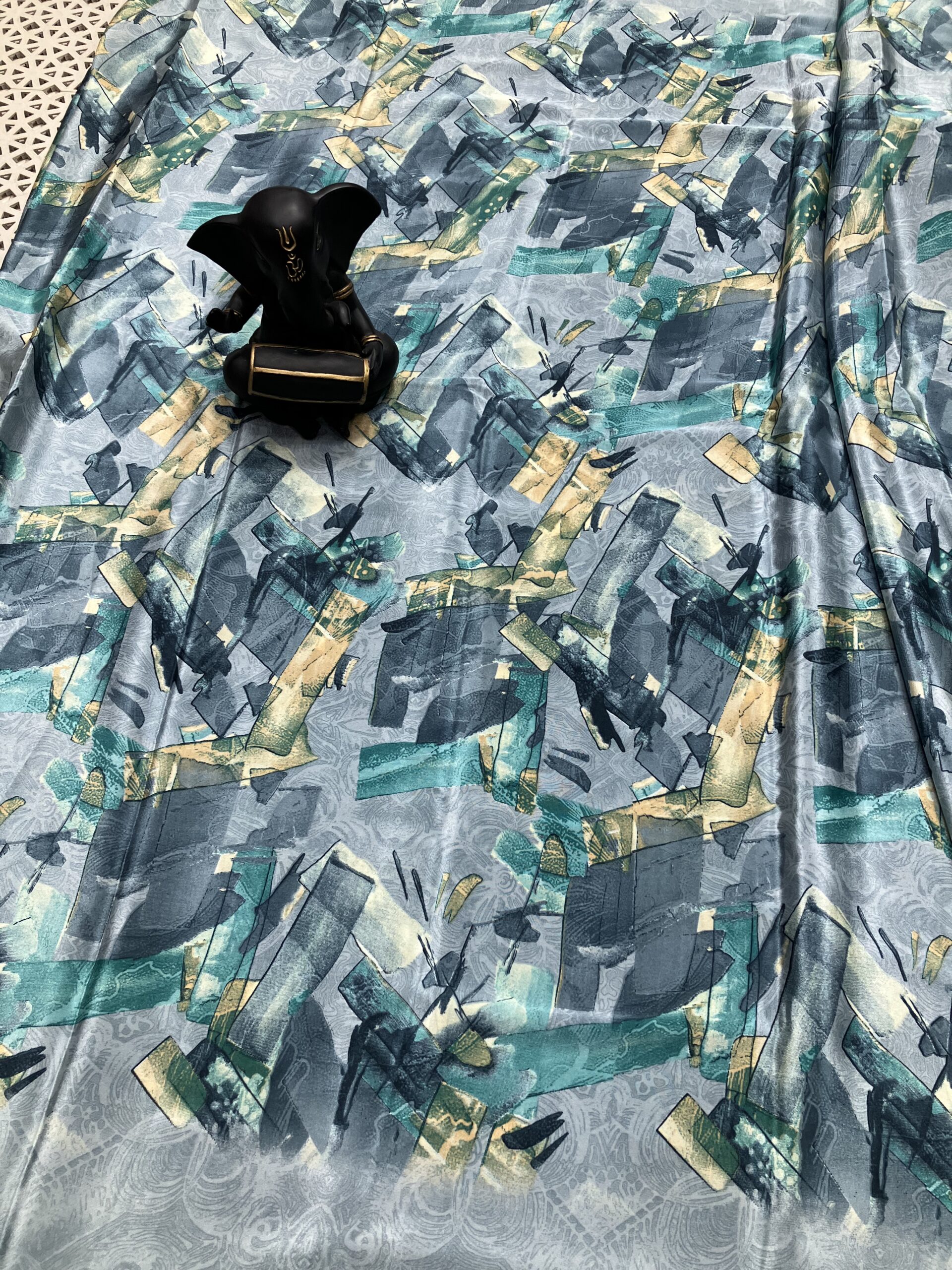 Make a contemporary style statement with this elegant soft saree featuring a modern abstract print. Designed in soothing shades of blue, teal, grey, and subtle hints of beige, the saree showcases artistic brush-stroke patterns that give it a refined yet trendy appeal.