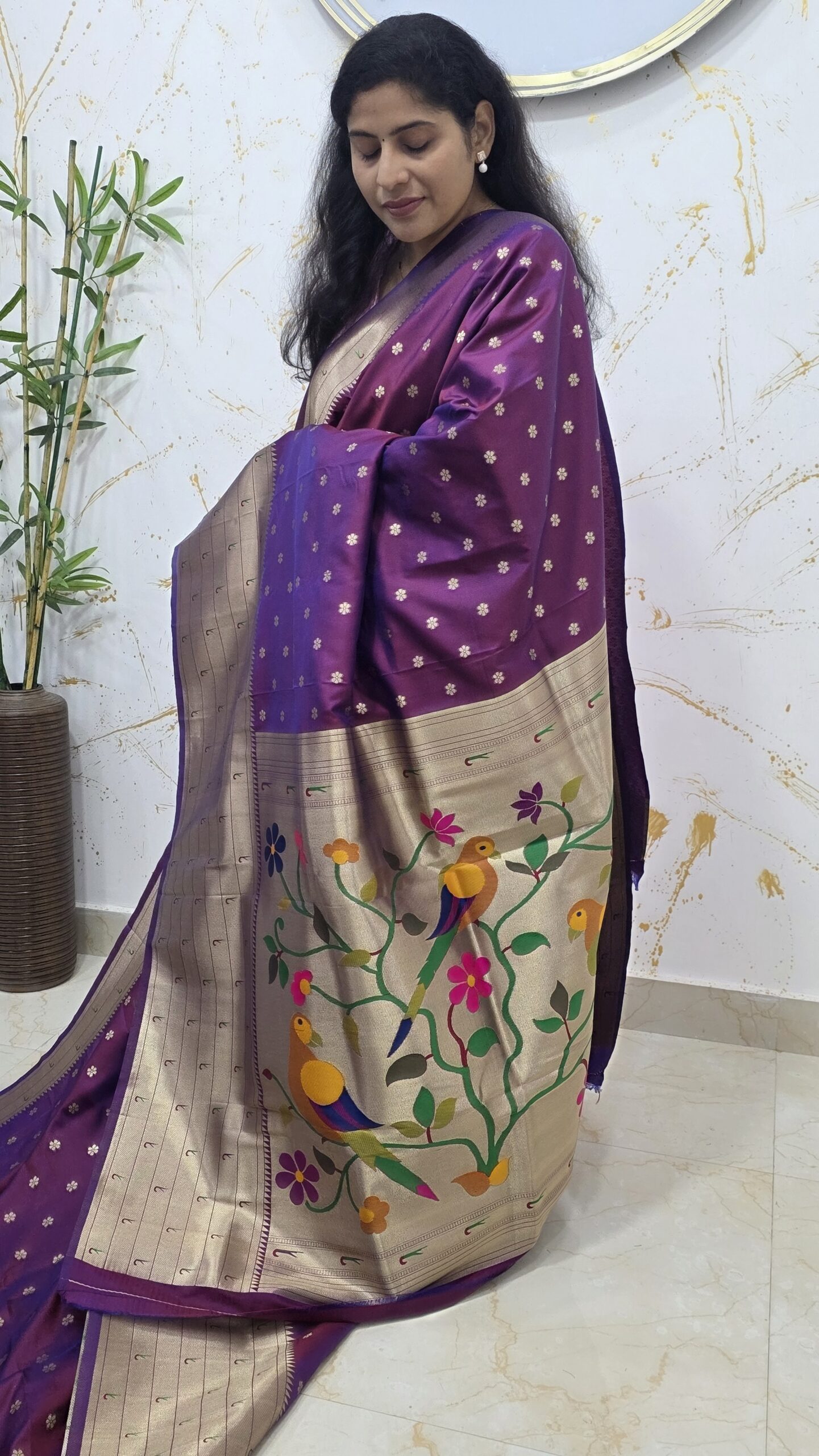 Enhance your festive wardrobe with this exquisite royal purple soft silk saree, designed to radiate grace and richness. The saree is adorned with fine gold zari floral buttas across the body, adding a sparkling yet elegant finish to its deep, vibrant colour.