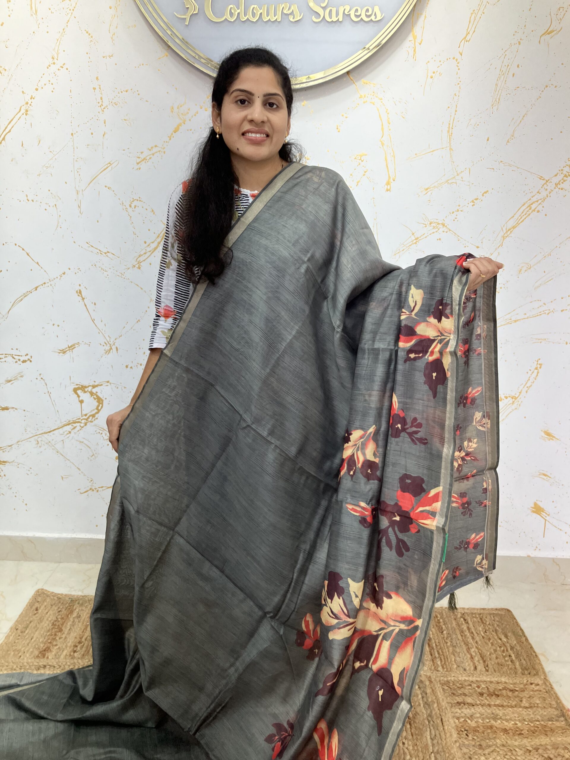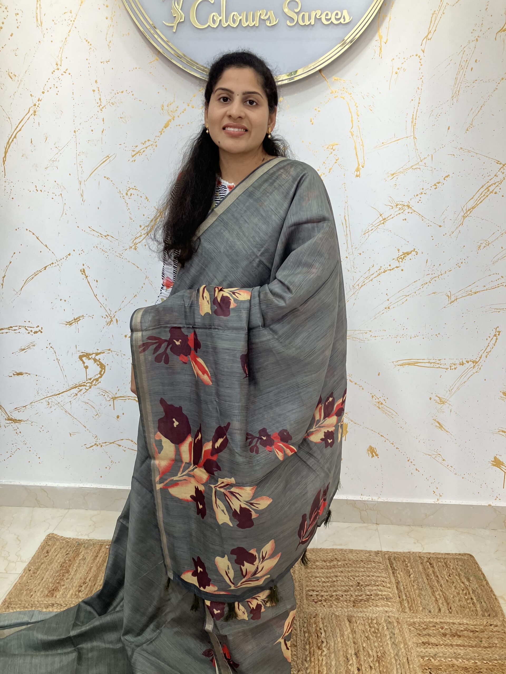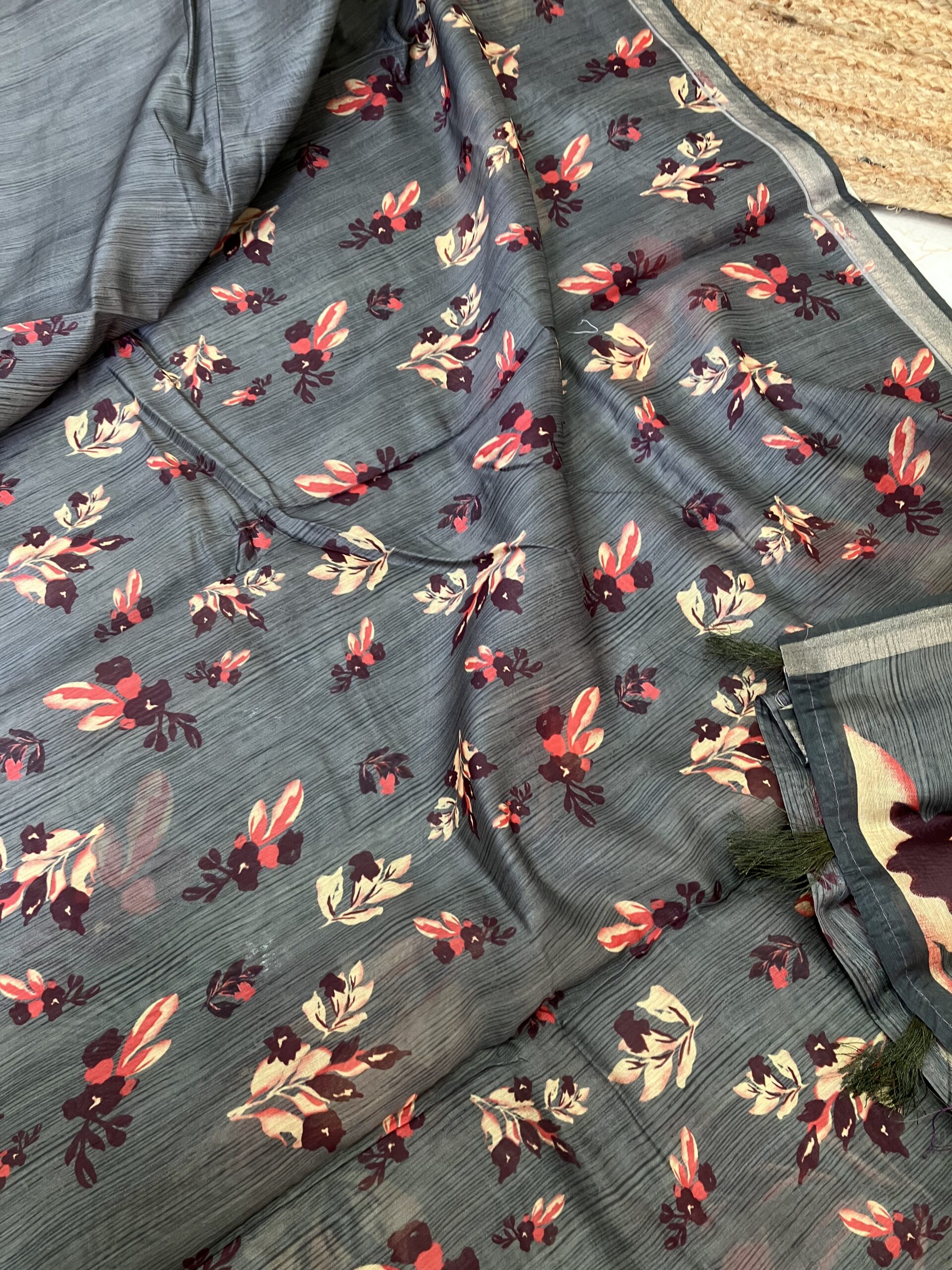 Understated elegance meets artistic detail in this beautiful charcoal grey saree. The solid-toned body showcases a subtle textured finish that lends a refined, contemporary appeal. The highlight of the saree is its graceful floral pallu, adorned with rich botanical prints in warm hues, adding depth and contrast to the minimal base.