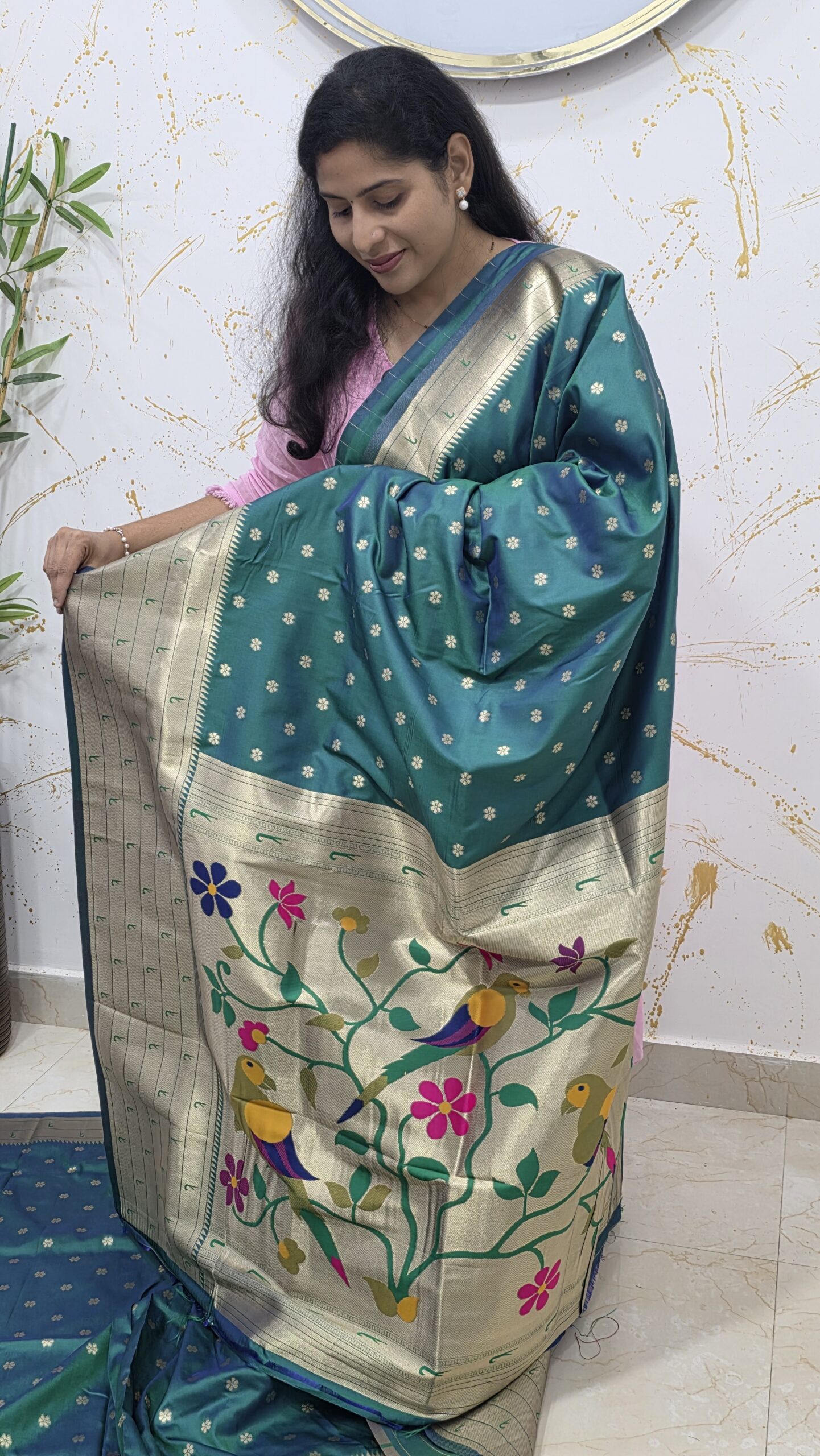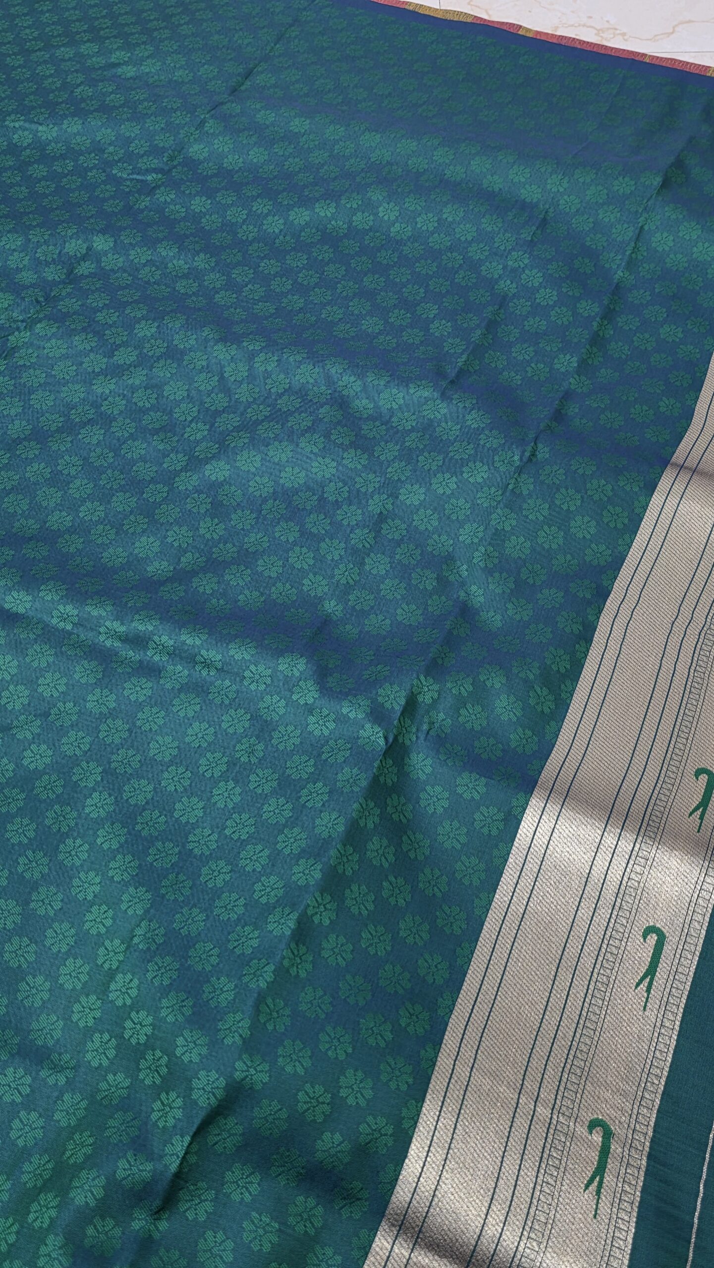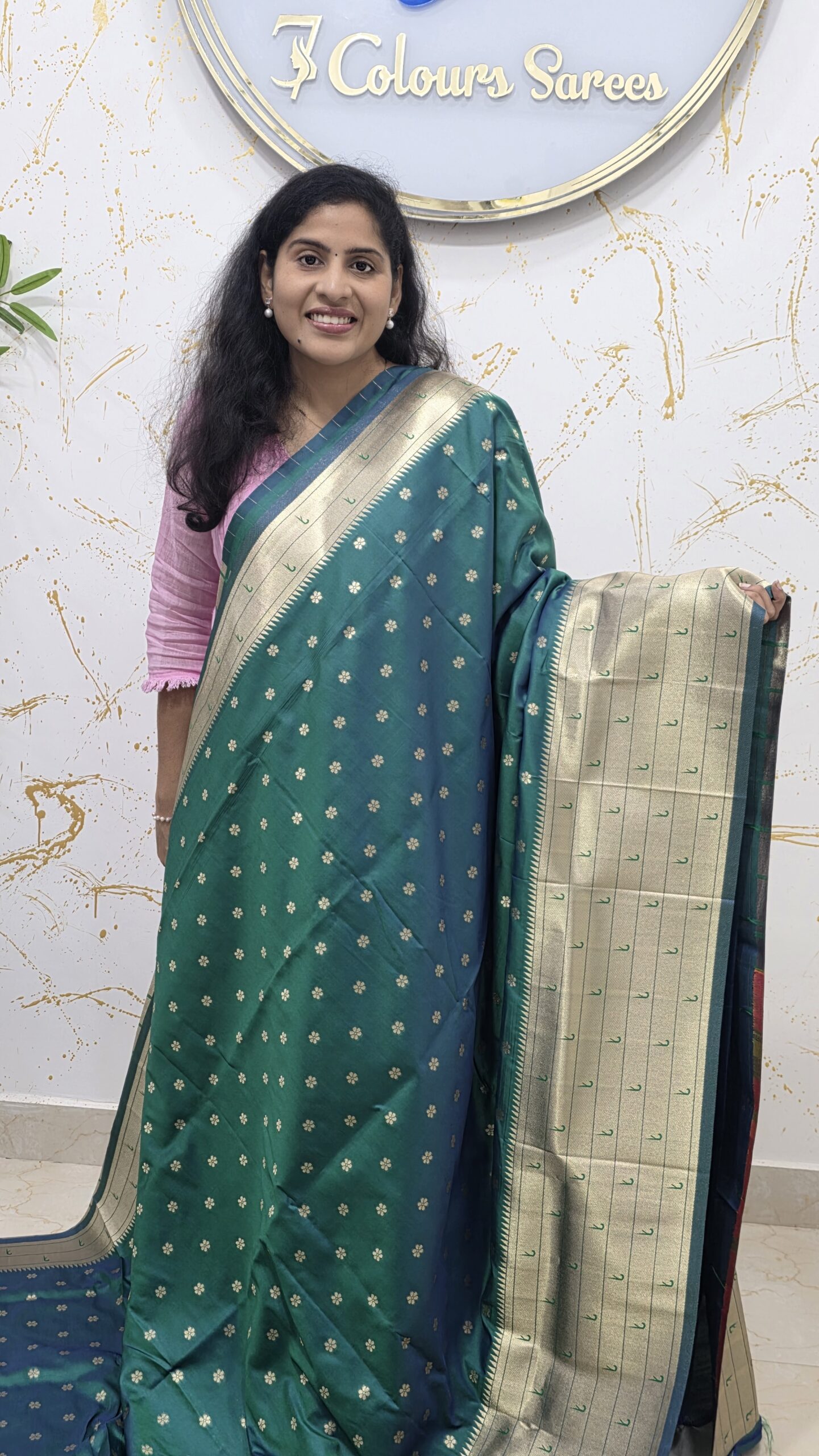 Embrace the charm of traditional elegance with this stunning teal–green soft silk saree, crafted to offer a perfect blend of colour, texture, and finesse. The saree is adorned with small gold zari floral buttas, giving it a mild sparkle that enhances its festive appeal without overpowering the design.